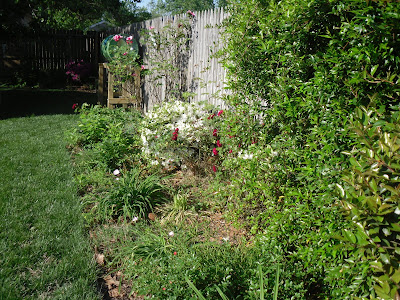 This is part of the flower bed that still needs some serious cleaning up. There are dead bushes that need to be pulled out and countless trees and weeds that need to be taken out.