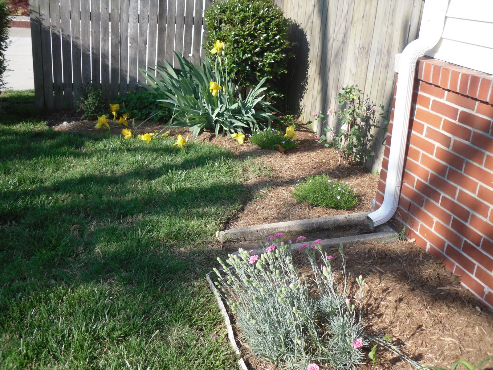 My other hydrangea is coming up in the center, Last year it was very sick so I am happy it looks healthy this year. I am not sure what color flowers it will have. I really want to make this flowerbed more curved rather than a straight line around the fence. Maybe its just me but I prefer organically shaped flowerbeds.